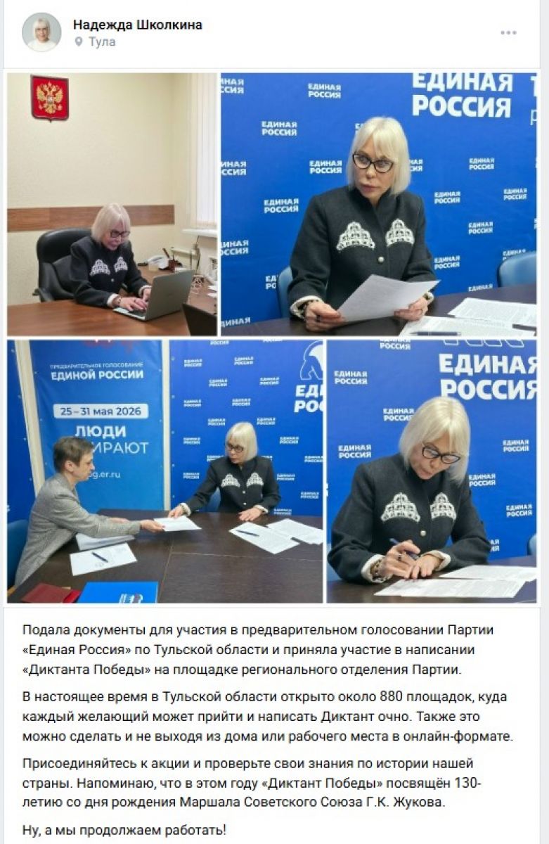 А завершила неделю Школкина весьма изящно – в Туле она подала документы на участие в предварительном голосовании «Единой России». Несмотря на то, что партия об этом событии еще рассказать не успела – на сайте не было ни одного релиза об этом – сама Надежда Школкина пост об этом написала хоть и весьма скромный.