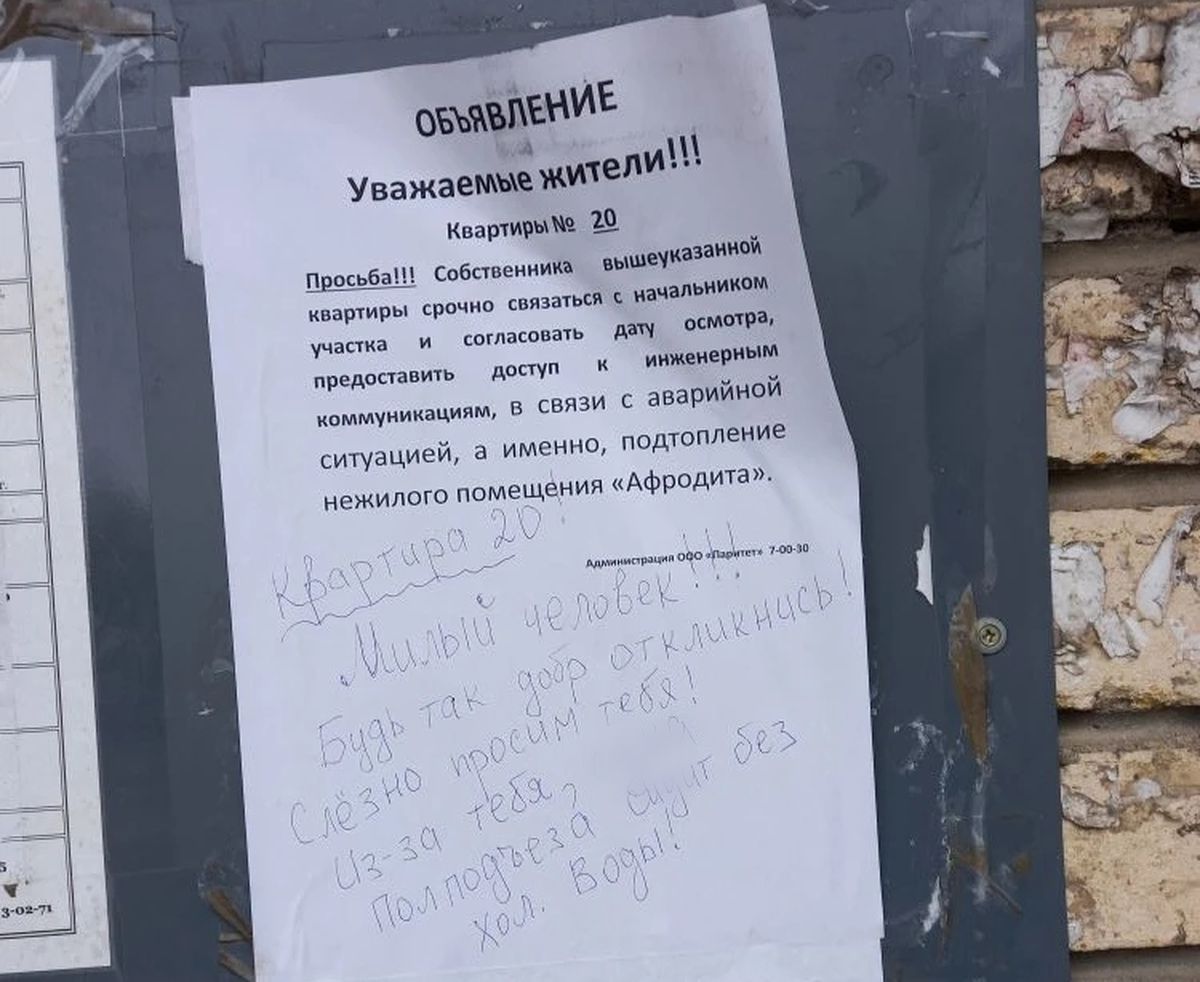Жители продолжают жить в антисанитарных условиях. Отчаявшись, они начали самостоятельно развешивать объявления в подъездах и просить владельца квартиры номер 20 выйти на связь и решить проблему.