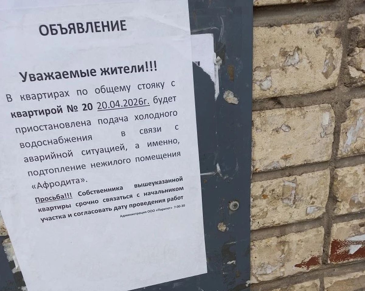 Объявление об отключении было размещено в подъездах 20 апреля, предупреждая о перекрытии стояка холодной воды из-за потопа от квартиры №20. Однако, несмотря на прошедшую неделю, вода так и не появилась.