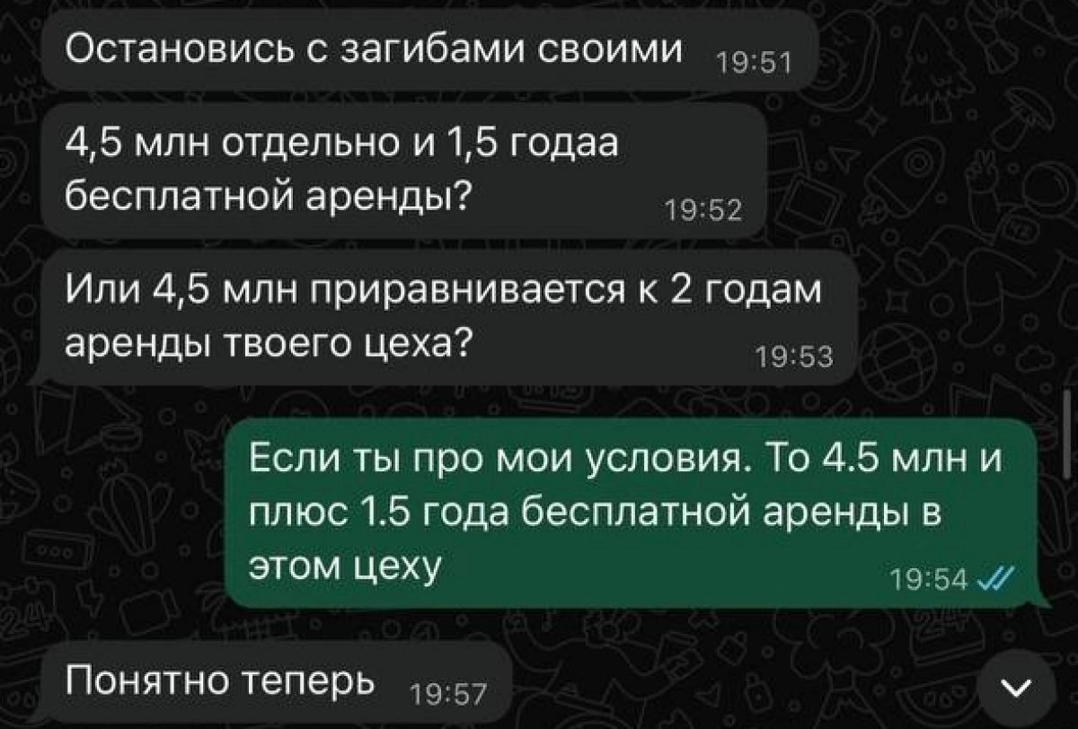 «Он пришёл ко мне с требованием в 700 000 рублей за цех и предложением сидеть год бесплатно. Я был в шоке от такого подхода, ведь он сам покупал помещение по рыночной стоимости. Теперь же он утверждает, что я заставляю его продать его имущество», – сказал Александр.