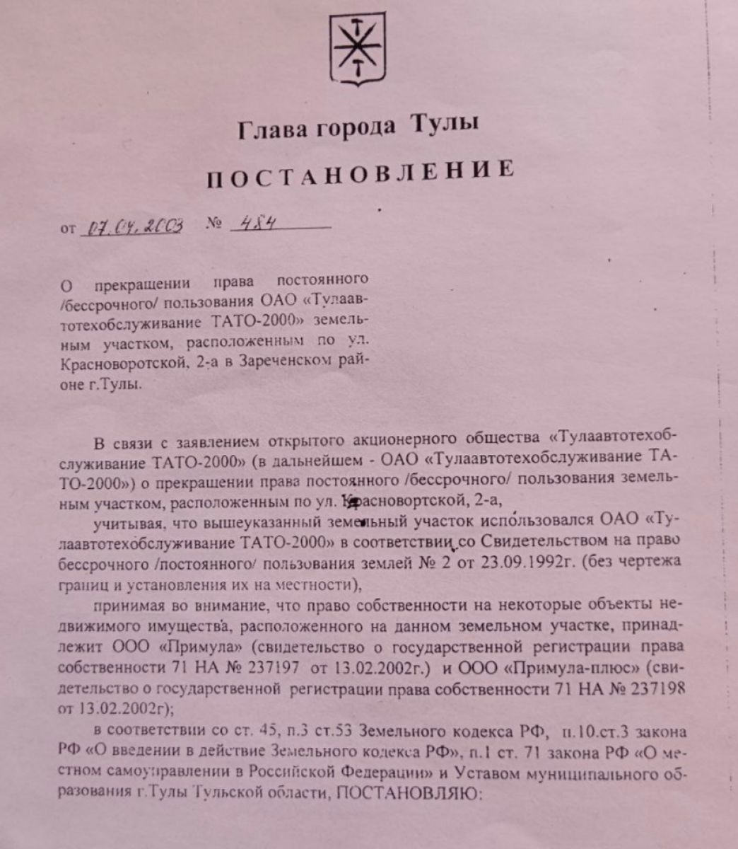 Уточним, что в постановлении главы города Тулы от 7 апреля 2003 года, предоставленном предпринимателем Василием Михеевым нашей редакции, говорится о прекращении права постоянного пользования ОАО «Тулаавтотехобслуживание ТАТО-2000» земельным участком, расположенным по улице Красноворосткой 2а, (ныне носит название Московское шоссе).
