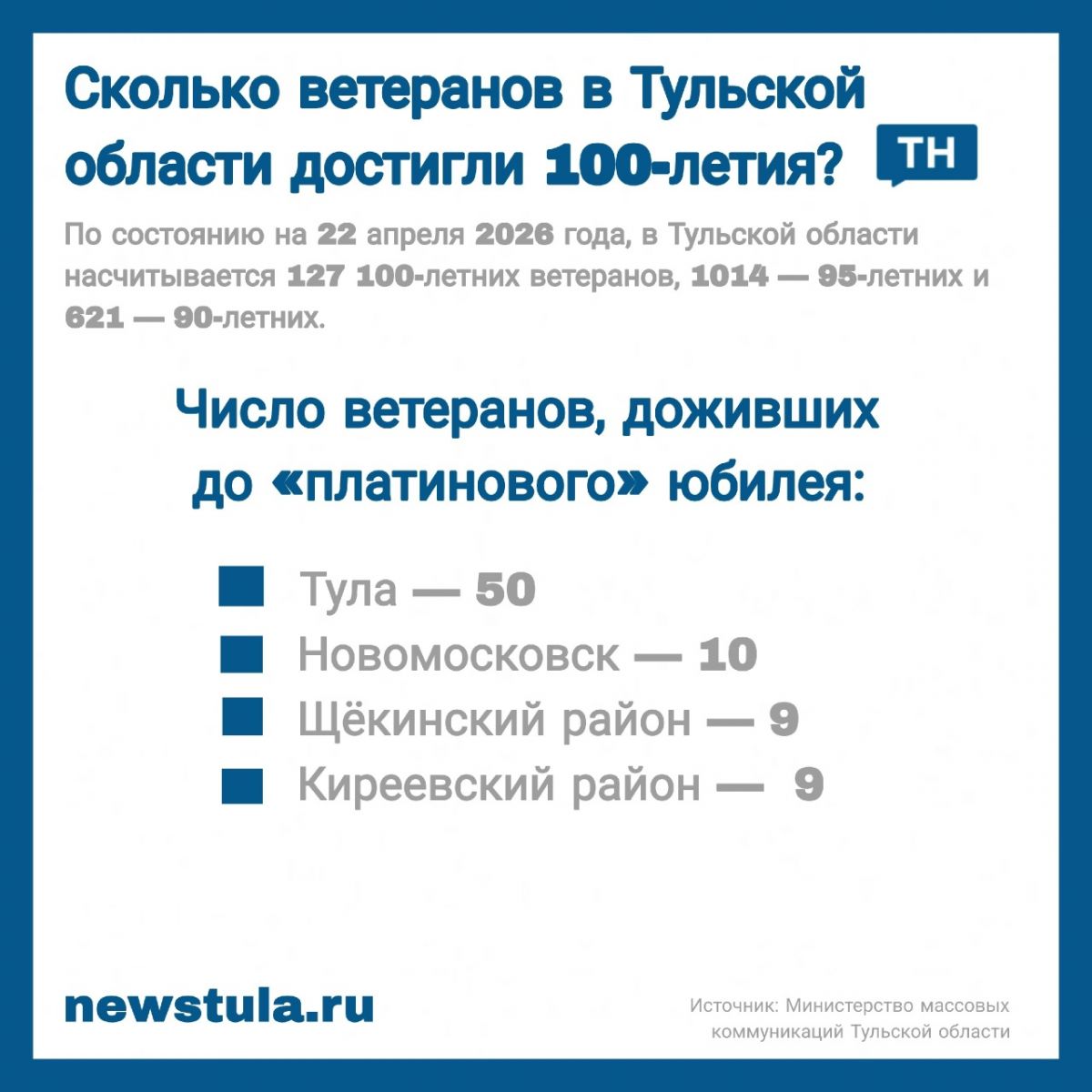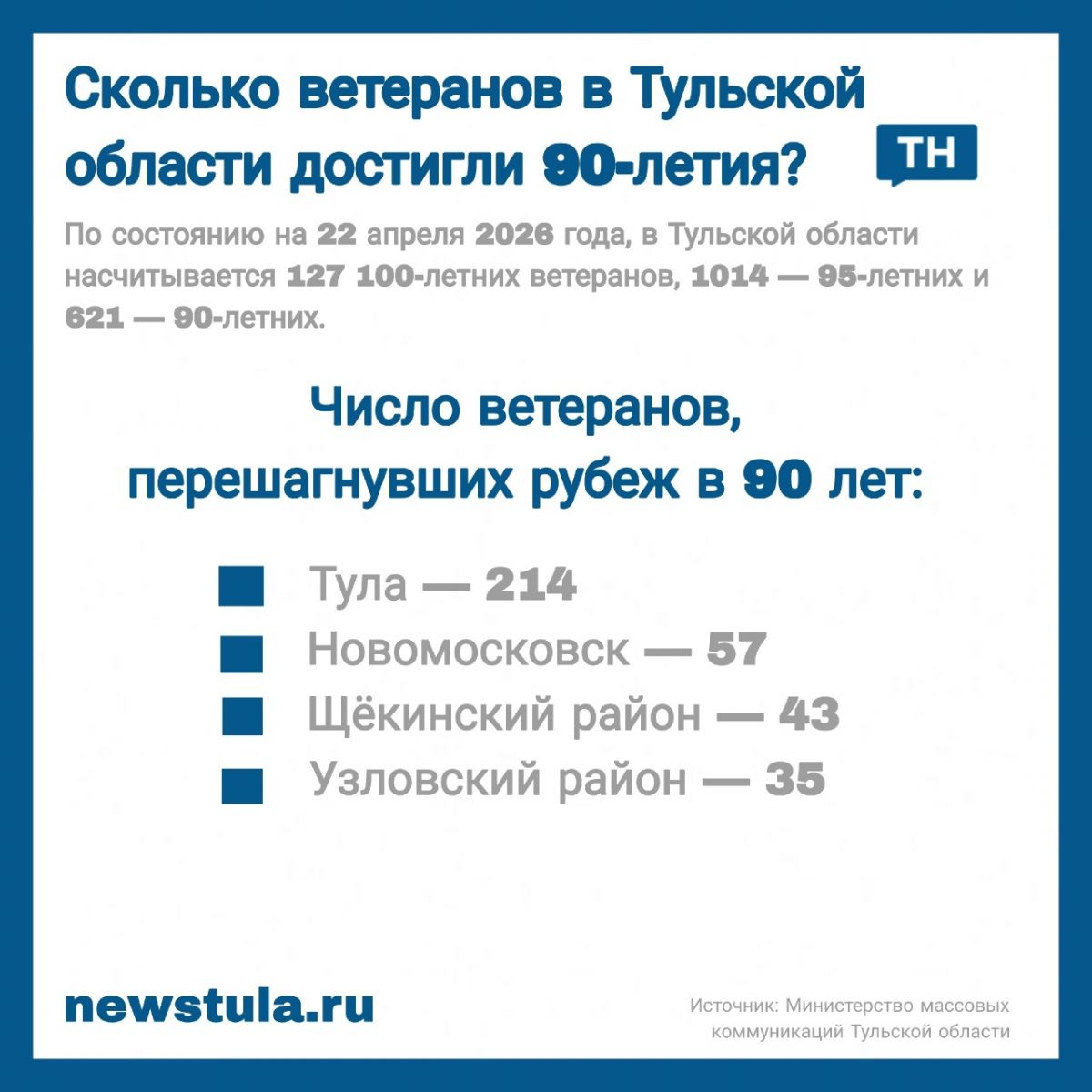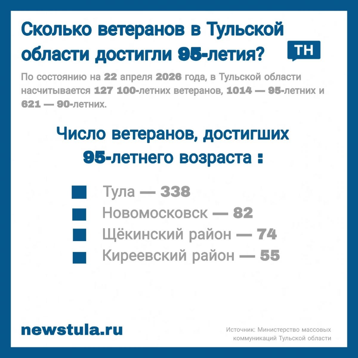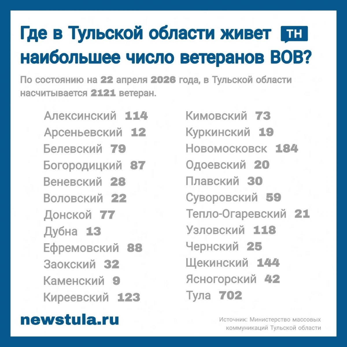 По состоянию на 22 апреля 2026 года, в Тульской области насчитывается 2121 ветеран.