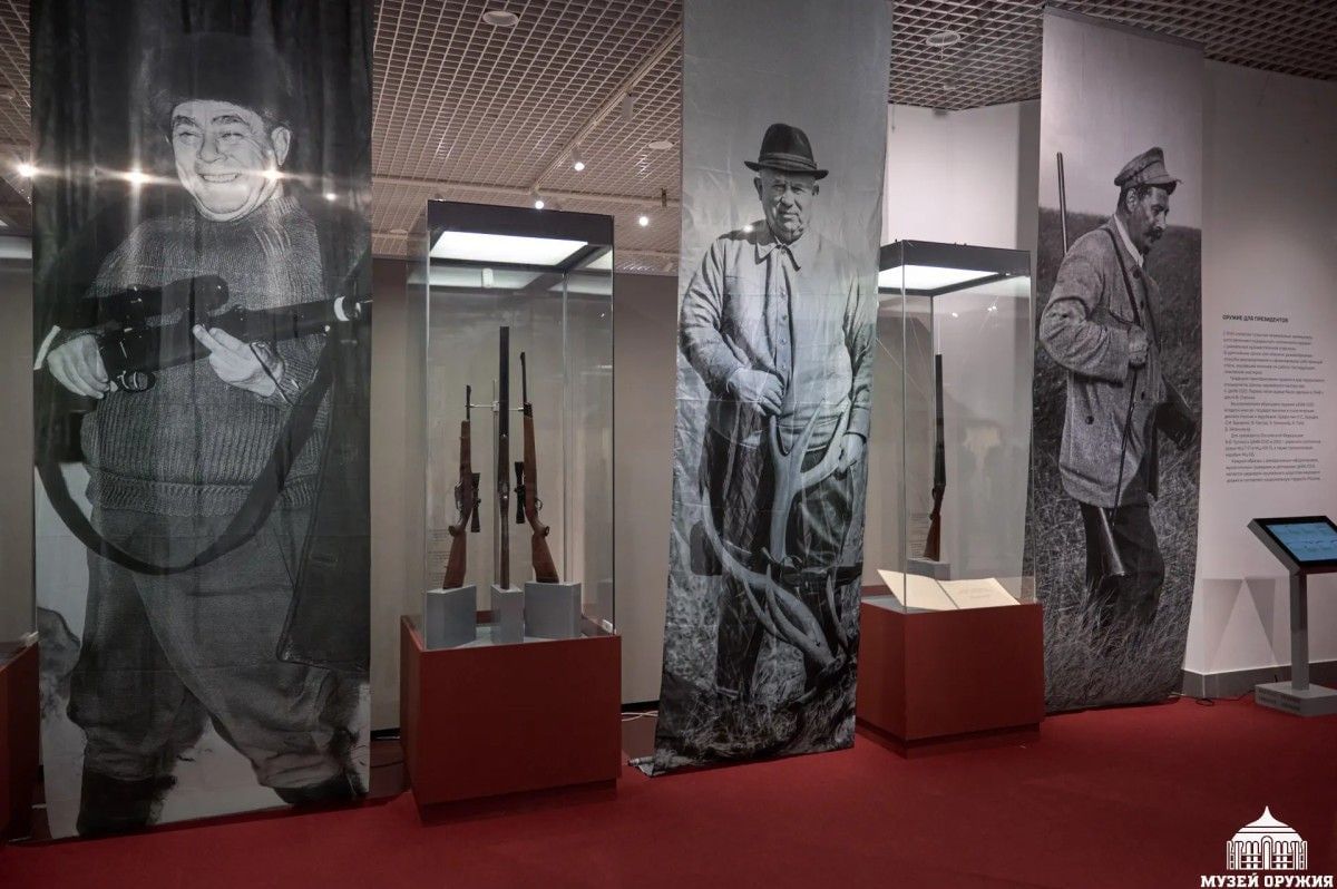 Центральное место в разделе, посвящённом охотничьей стихии, занимает уникальный экспонат - ружьё, изготовленное тульскими мастерами для И.В. Сталина в 1948 году. Этот раритет из собрания Государственного музея современной истории России является живым свидетельством преемственности традиций. О сохранении традиции изготовления оружия для государственных и политических деятелей свидетельствуют эксклюзивные модели, аналогичные тем, что дарили первым лицам государства и мировым лидерам. Среди них - Н.С. Хрущёв, Л.И. Брежнев, Фидель Кастро, Эрих Хонеккер и другие известные политические деятели.