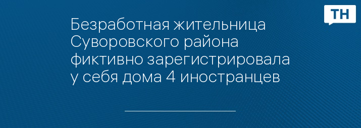 Полицейскими Суворовского района установлена нигде не работающая 35-летняя жительница посёлка Ханино, которая фиктивно поставила на регистрационный учёт в собственном доме четырёх иностранных граждан. Подозреваемая призналась в содеянном. В настоящее время в полиции проводится проверка всех обстоятельств происшествия.