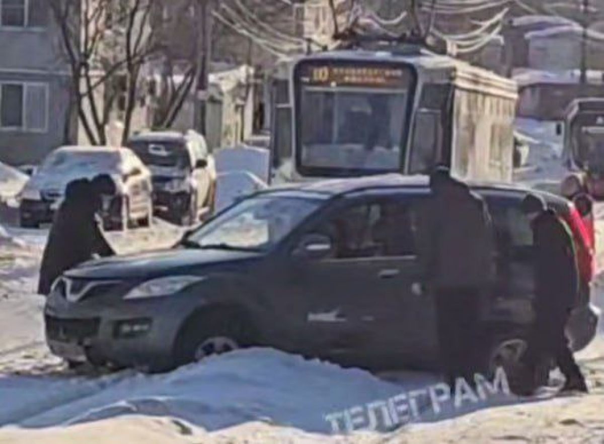 В Туле водитель застрял на трамвайных путях, заблокировав движение на Плеханова