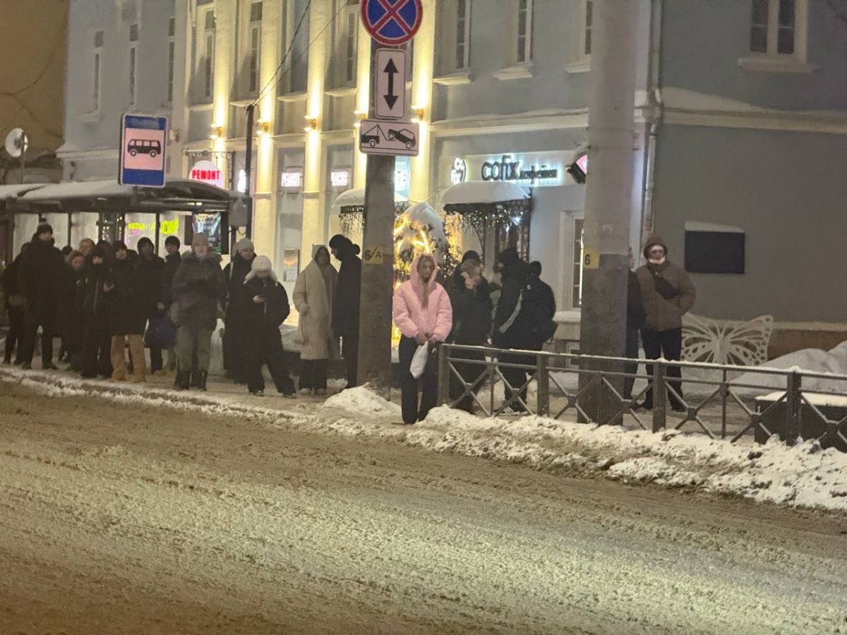 Толпа туляков ждет транспорт на остановке в центре города