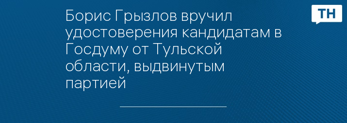 В начале встречи он заявил, что сегодня есть возможность пообщаться и скоординировать действия в преддверии выборов. Борис Грызлов вручил кандидатам удостоверения кандидатов в депутаты Государственной Думы 6 созыва. Удостоверение получили губернатор Тульской области Владимир Груздев, депутаты Госдумы РФ Дмитрий Савельев и Борис Зубицкий, руководитель приемной Владимира Путина Владимир Афонский, ректор ТГПУ им. Л.Н.Толстого Надежда Шайденко, начальник цеха №3 ЗАО «Тяжпромарматура» Дмитрий Смирнов и представитель Федерации независимых профсоюзов, участник Народных праймериз Вячеслав Синяев.