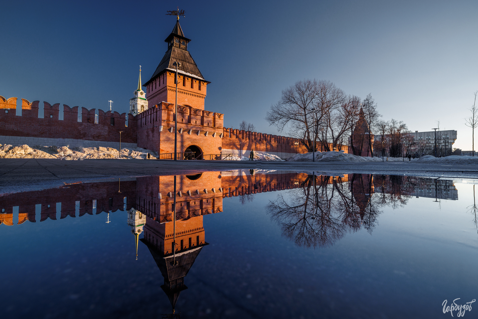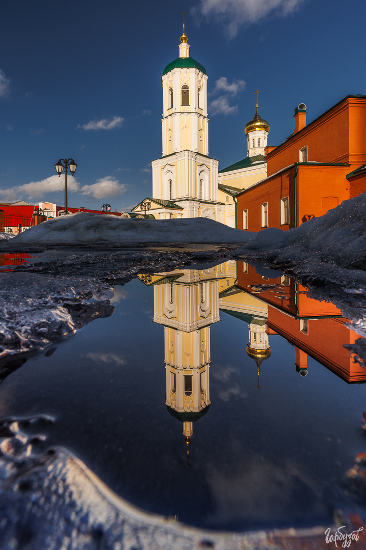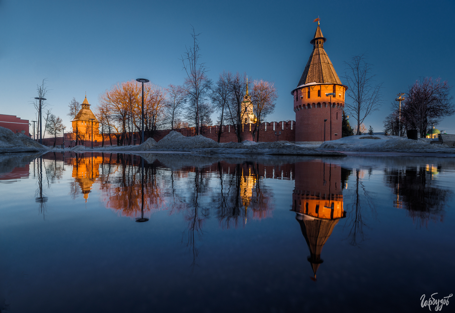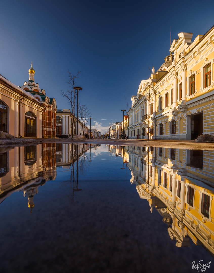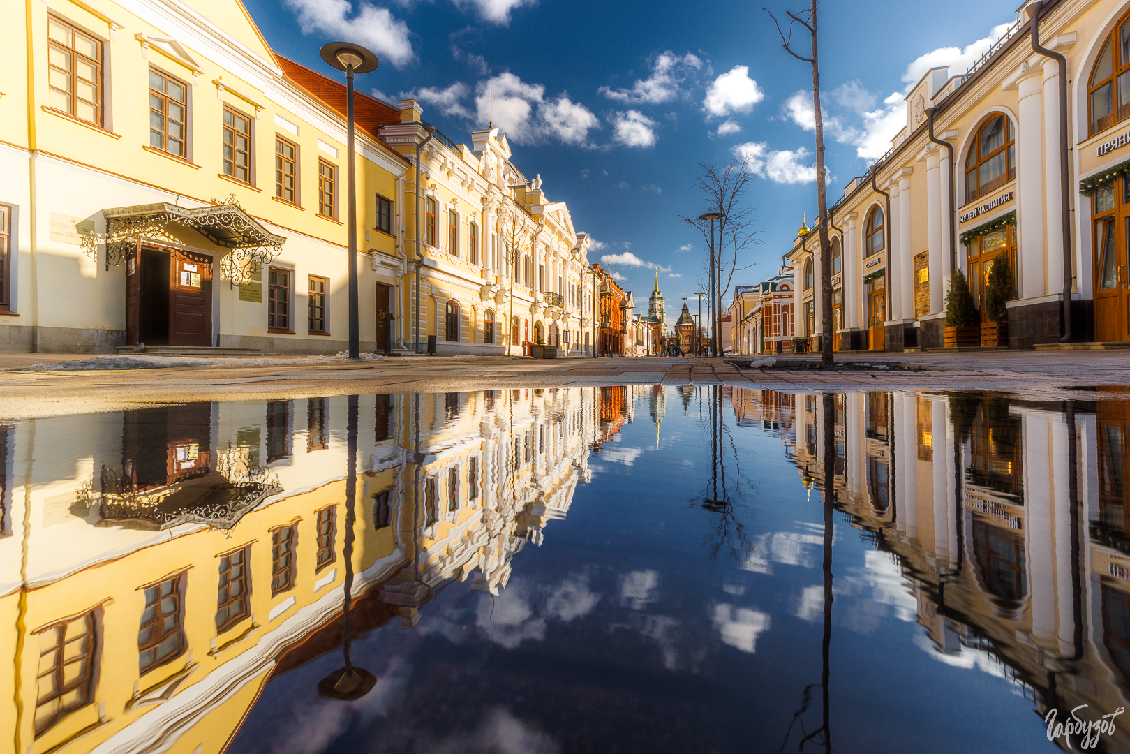 Но это летом. Пока же на улице Металлистов — в самом центре музейного квартала, группа тульских фотографов снова снимала его главную весеннюю достопримечательность — огромную лужу. Люблю я ее. Так здорово все отражается: Покровская церковь, старинные здания, стильные фонари, вывески… Кажется, что всей этой красоты вдвое больше, чем на самом деле. Ну правда!