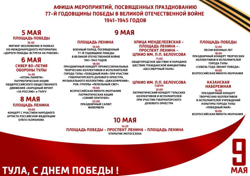 Накануне праздника, 8 мая в 19:00 в Туле на площади Ленина пройдет концерт с участием народного артиста России Олега Газманова. 9 мая в 10:00 там же начнется Парад Победы. До 19:00 пройдут еще несколько событий, после на всех городских площадках пройдет прямая трансляция Всероссийской Минуты Молчания.
